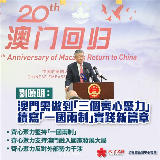 中國駐英大使劉曉明當地時間16日在倫敦出席慶祝澳門回歸20周年活動。劉曉明指出,當前,中國特色社會主義進入新時代,「一國兩制」偉大事業也進入了新時代。新時代續寫「一國兩制」在澳門成功實踐的新篇章,需要做到「三個齊心聚力」,...[详细]